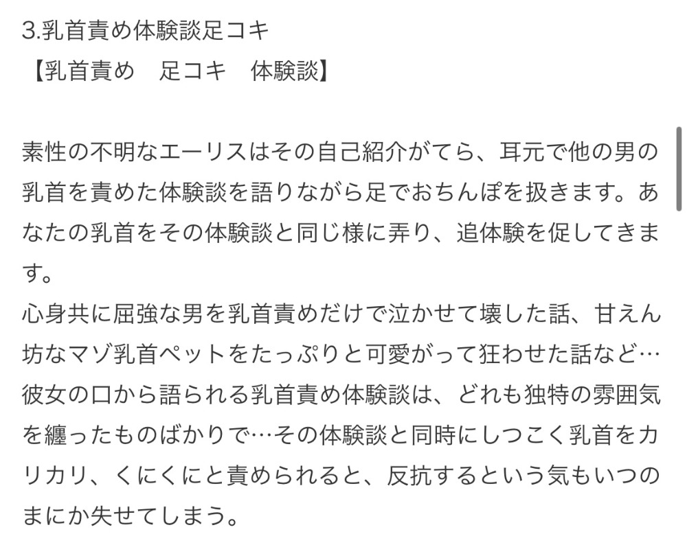 特に乳首責め体験談足コキが同じシチュエーションですね!他のマゾを乳首責めした時のリアルな体験談を耳元で囁かれながら、背後から乳首責め足コキされちゃいます。