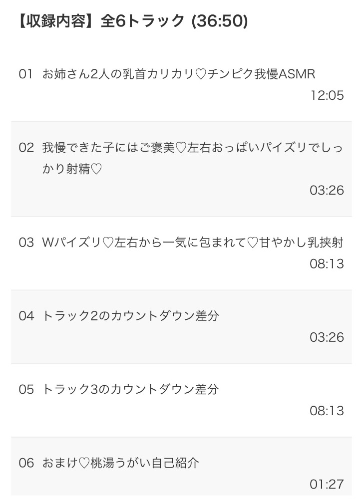 聞きながら実際にチンピク我慢に挑戦できるのかいいですね!まぁ我慢できるわけないくらい両サイドからの言葉責め、高速カリカリ乳首責め、耳舐めがあるわけですが・・・序盤からかなり激しく責められるので時間は短いですか非常に満足感があります。