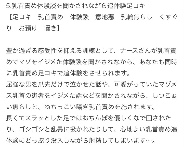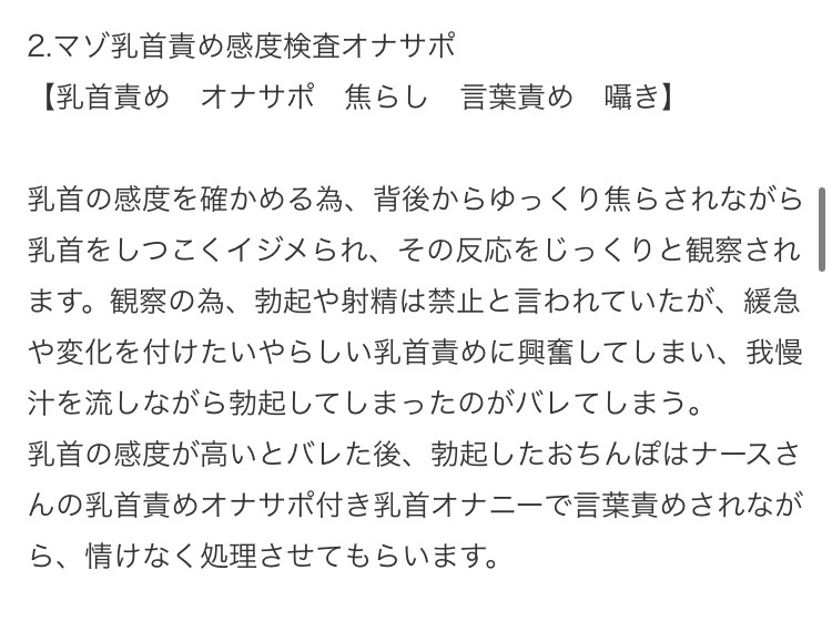 序盤はゆっくり、指の腹でスリスリ、さわさわ、カリカリ乳首責め。途中から手コキもしてくれますが「あくまでも乳首責め治療だから興奮しておもらし射精してはいけません。」と念押しされます。m男には大大大好物のシチュエーションですね。